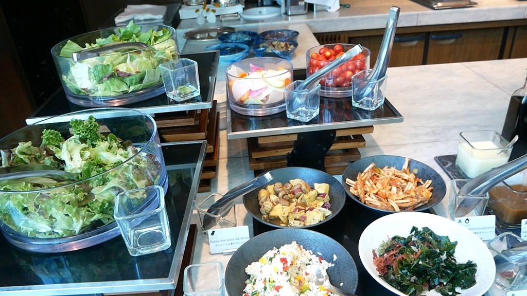 The salad selection features healthy options such as silver-stripe round herring with white maitake, Akita Komachi rice and Oita Otohime vegetables in garlic rice salad, and seaweed and sea grapes from Sanriku.