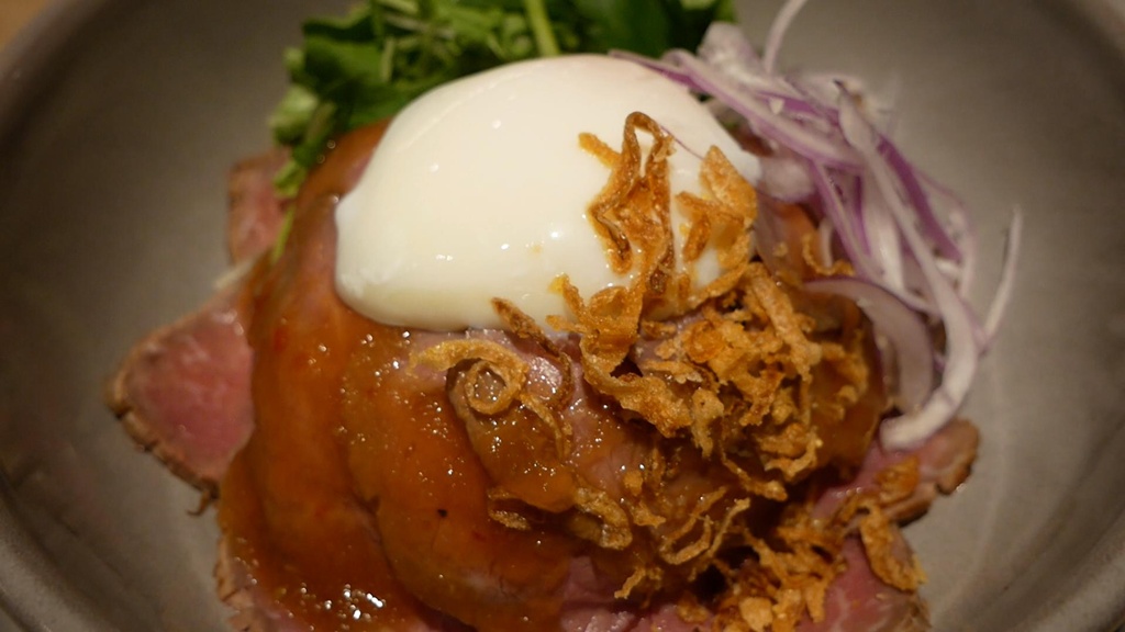 The signature roast beef rice bowl is tender, juicy, and topped with a perfect soft-boiled egg.