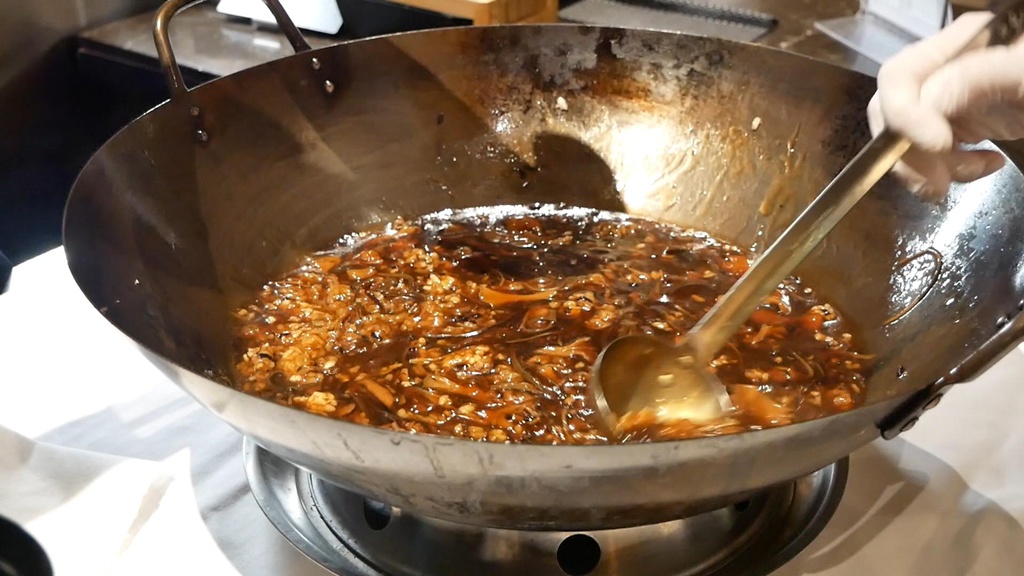 A special time service dish features crispy rice topped with shark fin and mixed vegetables in a rich sauce.